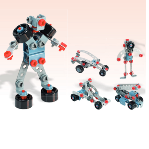This mechanical construction set has endless possibilities! Includes several formats of flexible platelets, pins, shafts, screws and nuts, and various wheel sizes. Also includes 6 activity cards to help get you started!